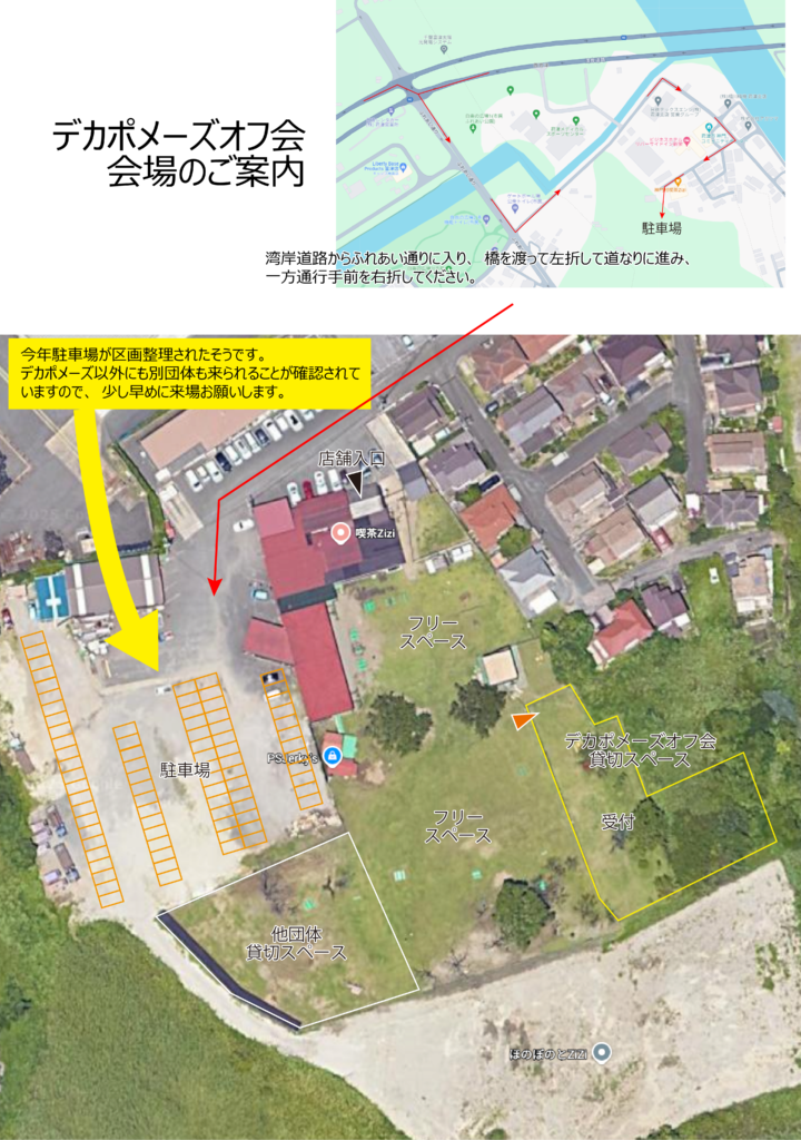 会場のZiziさんは80台以上の駐車スペースを確保されていますが、当日はデカポメーズオフ会参加者のほか、もう一つの貸切スペースの利用者や一般の利用者も来られるため、駐車場が大変混み合うことが想定されます。